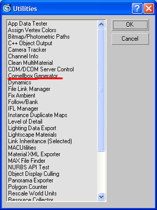 Since the Cornellbox generator will not automatically appear in the short list of utilities you have to